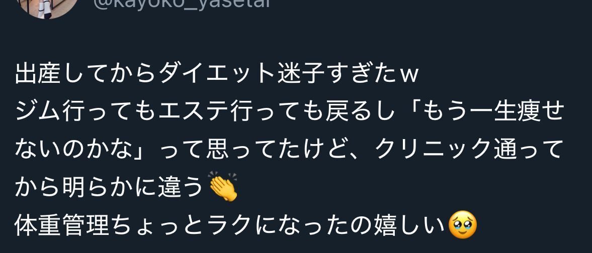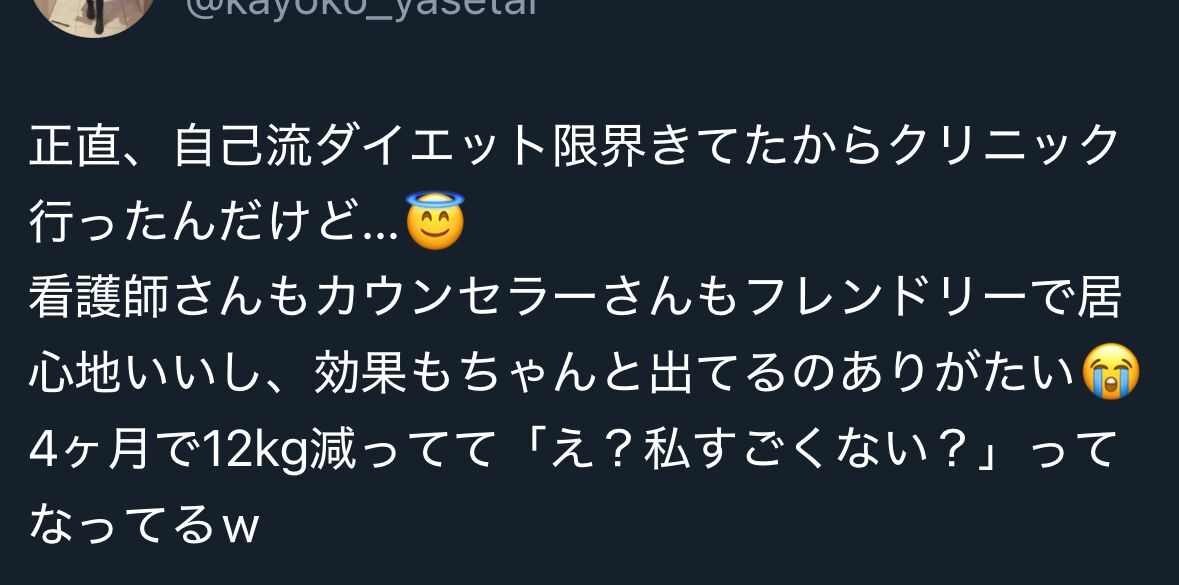 過去に運動や食事制限のダイエットをしたことがあり元に戻ってしまってましたが、このクリニックでは効果も順調で4ヶ月で12kgほど落ちています